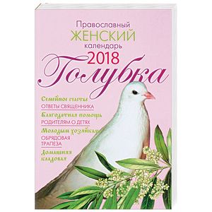 В православном женском календаре "Голубка" на 2018 год читательницы найдут ответы священника на вопросы прихожанок, наставления родителям о воспитании детей, секреты семейного счастья из творений святых отцов и подвижников Церкви, молитвы о детях и семейном благополучии, советы молодым хозяйкам, рецепты разнообразных блюд и многое другое.