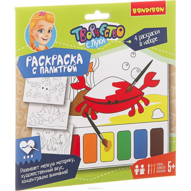 Состав набора: 4 листа-раскраски с палитрой, кисть.