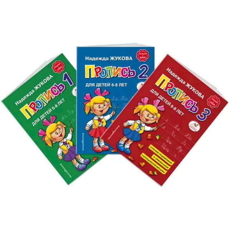 Комплект из 3 тетрадей для обучения детей письму. В основе обучения по методике Надежды Жуковой лежит слоговой принцип русской графики. Для удобства обучения материал прописей разделен на 3 тетради, с которыми желательно работать последовательно. В первой тетради изложены правила обучения написанию букв А, У, О, М, С, Ы, X, Р, Ш, Л, Н; во второй —К, Т, И, П, З, Й, Г, В, Д, Б, Ж, Е; в третьей — Ь, Я, Ю, Ё, Ч, Э, У, Ф, Щ. Это прекрасное подспорье для дошкольников и детей, у которых написание букв вызывает затруднения. Прописи являются приложением к знаменитому "Букварю" Надежды Жуковой, который успешно используют все родители, воспитатели и педагоги.