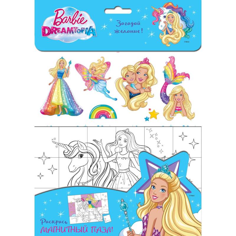 Чтобы тебе не было скучно, Барби придумала интересный набор для развлечения. Вместе с ней ты будешь раскрашивать красивые большие картинки, обклеивать всё вокруг наклейками, а ещё сможешь раскрасить пазл и повесить его на холодильник: пазл - магнитный!