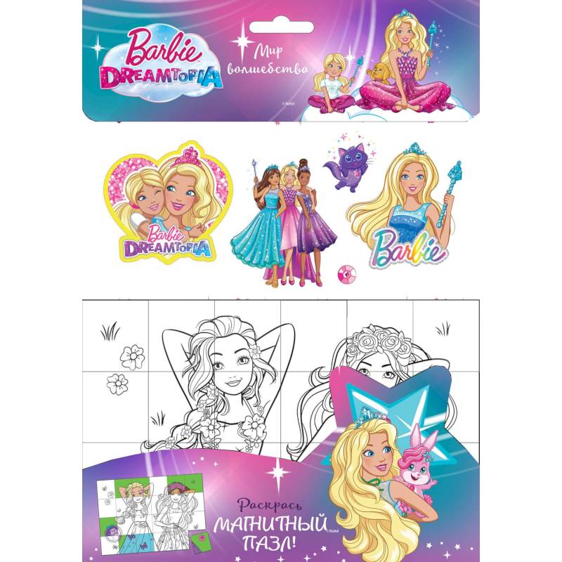 Чтобы тебе не было скучно, Барби придумала интересный набор для развлечения. Вместе с ней ты будешь раскрашивать красивые большие картинки, обклеивать всё вокруг наклейками, а ещё сможешь раскрасить пазл и повесить его на холодильник: пазл - магнитный!