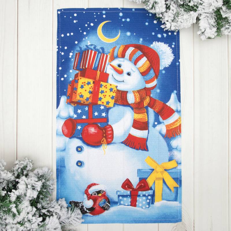 Полотенце "Снеговик" 35x60 см, 100% хлопок, вафельное полотно 162г/м2