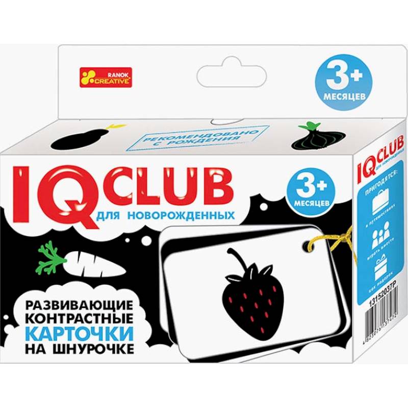 Набор включает 10 двусторонних карточек на шнурке, содержащих 20 контрастных иллюстраций.
