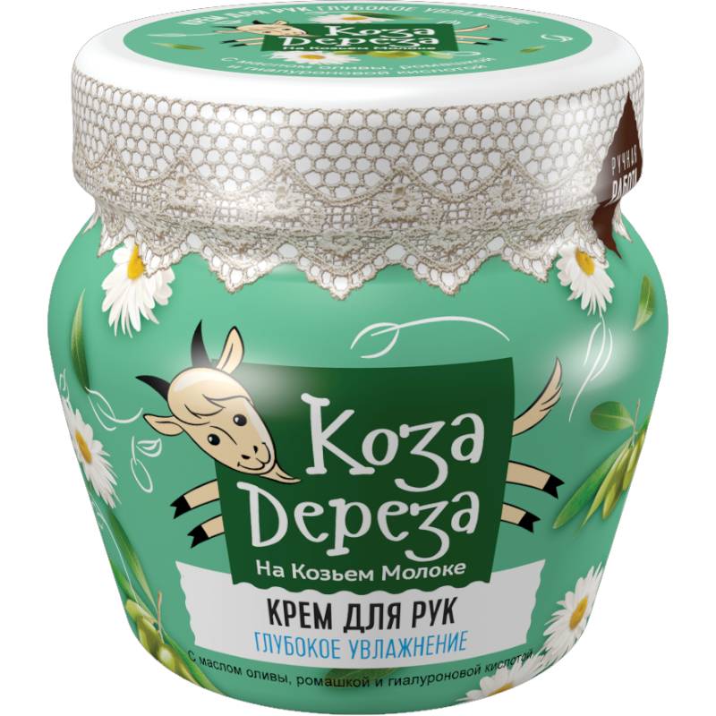 Легкая текстура крема на основе козьего молока с маслом оливы, ромашкой и гиалуроновой кислотой мгновенно впитывается в кожу, глубоко питает, смягчает, восстанавливает и омолаживает кожу рук.