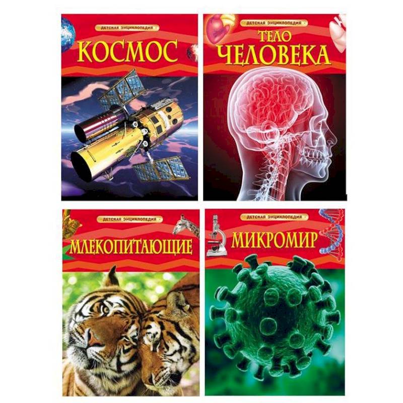 В комплект входят 4 книги из серии "Детская энциклопедия".1) Книга "Космос" рассказывает о планетах, звездах, кометах, астероидах, Солнечной системе и небесных явлениях, знакомит с теорией рождения Вселенной и многим другим.