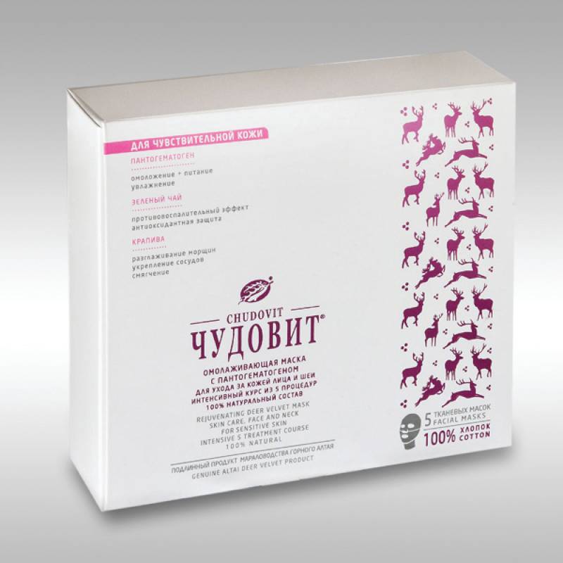 ЧУДОВИТ, омолаживающая маска для ухода за кожей лица и шеи (д/чувствительной кожи), 5 саше-пакетиков по 3г + 5 хлопковых масок