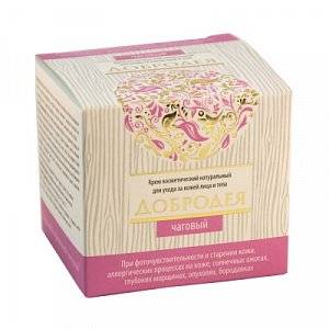 Крем косметический «Добродея» чаговый – натуральный крем на основе концентрата биомассы чаги, экстракта календулы, экстракта лафанта анисового, экстракта ромашки, альгината натрия, каменного масла. Крем не содержит синтетических компонентов, эмульгаторов, консервантов.