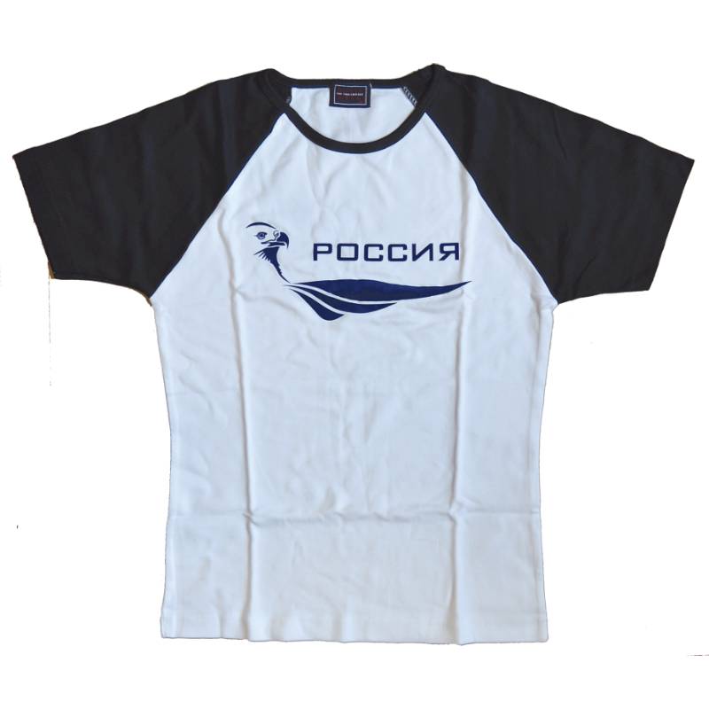 Футболка женская, белая с синими рукавами. РОССИЯ. Размер XL (с головой орла)