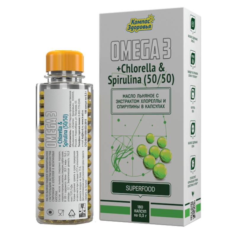 Состав: масло льняное, спирулина порошок, хлорелла порошок, желатин, глицерин, сорбат калия.