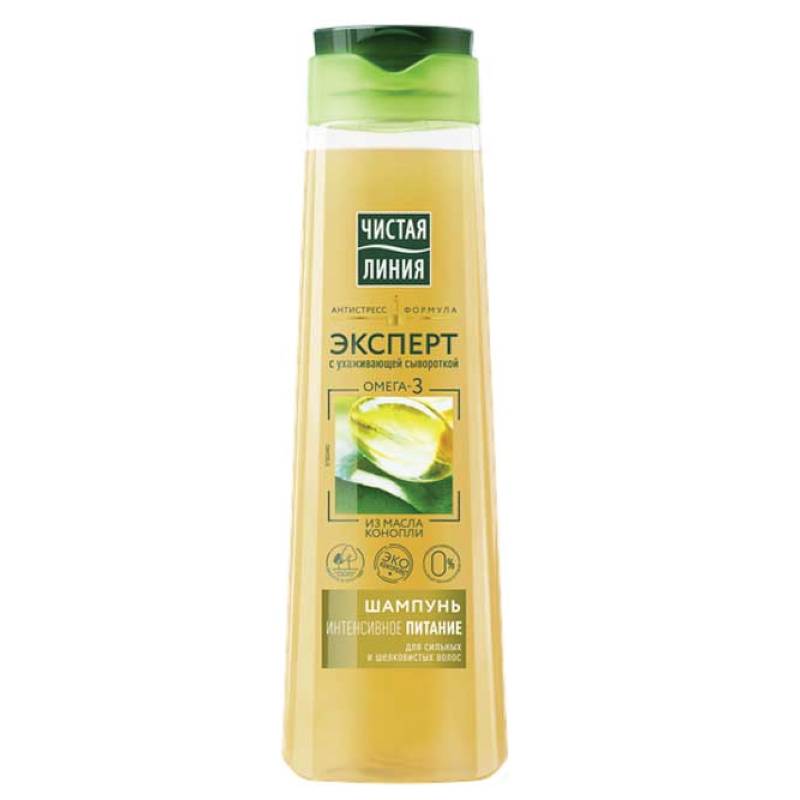 Новая линейка средств Чистая Линия ЭКСПЕРТ помогает создать полезный рацион для красоты и достичь желаемого результата в уходе за волосами. Каждый продукт линейки ЭКСПЕРТ содержит ухаживающую сыворотку и особо эффективные натуральные компоненты для питания, увлажнения и свежести волос. Антистресс формула помогает сохранить красоту в условиях ежедневного воздействия стресс-факторов окружающей среды (загрязнения, токсины, сухой воздух, укладка). В выборе натуральных компонентов, Эксперты придерживаются подхода использования инновационных технологий для извлечения максимальной пользы из растений. Ищешь шампунь для питания и восстановления волос? В шампуне ЧИСТАЯ ЛИНИЯ ИНТЕНСИВНОЕ ПИТАНИЕ вся сила Омега-3, полученной из растительного источника – масла конопли. Масло конопли превосходит многие масла, так как содержит особо питательную полиненасыщенную жирную кислоту – Омега-3. Омега-3 – редкий и ценный компонент для ухода за волосами. Шампунь с ОМЕГА 3 обеспечивает интенсивное питание и восстановление структуры волос. Волосы восстанавливаются, становятся более густыми, сильными и шелковистыми. Без эффекта утяжеления. Ухаживающая сыворотка в составе шампуня проникает глубоко в структуру волоса, защищает от воздействия стресс-факторов. Без силиконов. Используйте шампунь совместно с Бальзамом-сывороткой Эксперт ИНТЕНСИВНОЕ ПИТАНИЕ. РЕЗУЛЬТАТ: волосы восстановлены, сильные и красивые по всей длине. Забота о красоте – в нашей природе В сочетании с активными компонентами, при совместном использовании с бальзамом. В пределах кутикулы, при совместном использовании с бальзамом.