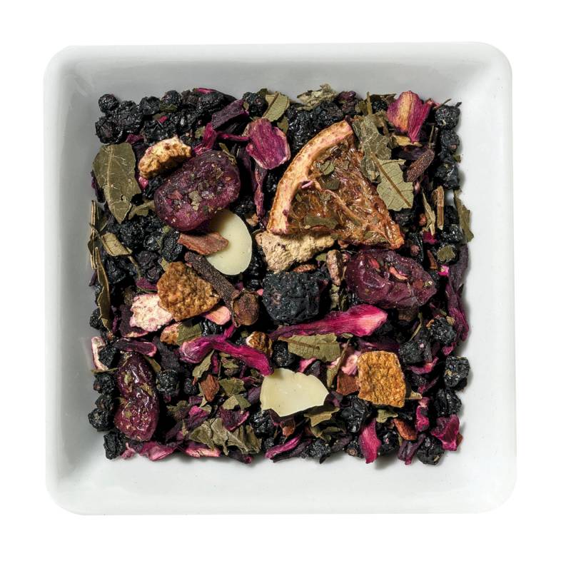 Состав: ягоды бузины, цветки гибискуса, ягоды черноплодной рябины, клюква,сладкие листья ежевики, цедра цитрусовых, корица, аромат, дольки цитрусовых, гвоздика, черника, дольки клюквы, нарезанный миндаль.