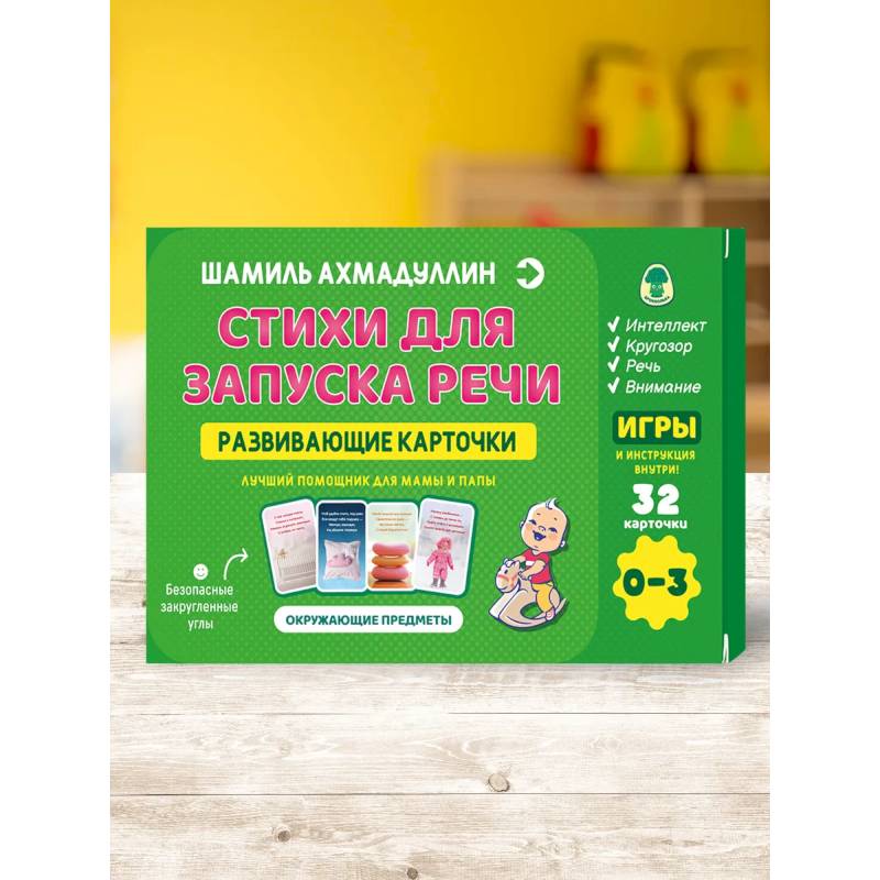 В первый год жизни особенно важно познакомить малыша с большим количеством окружающих его предметов и сделать это грамотно. В наборе вы найдете 32 карточки с картинками. 30 первых содержат стихотворения о вещах, с которыми ребенок встречается чаще всего, а две последние карточки (по 30 картинок на каждой) нужны для развивающих игр. Игры с набором расширят кругозор малыша, ускорят переход от пассивной к активной речи и помогут ребенку быстрее избавиться от упрощенных форм слов.