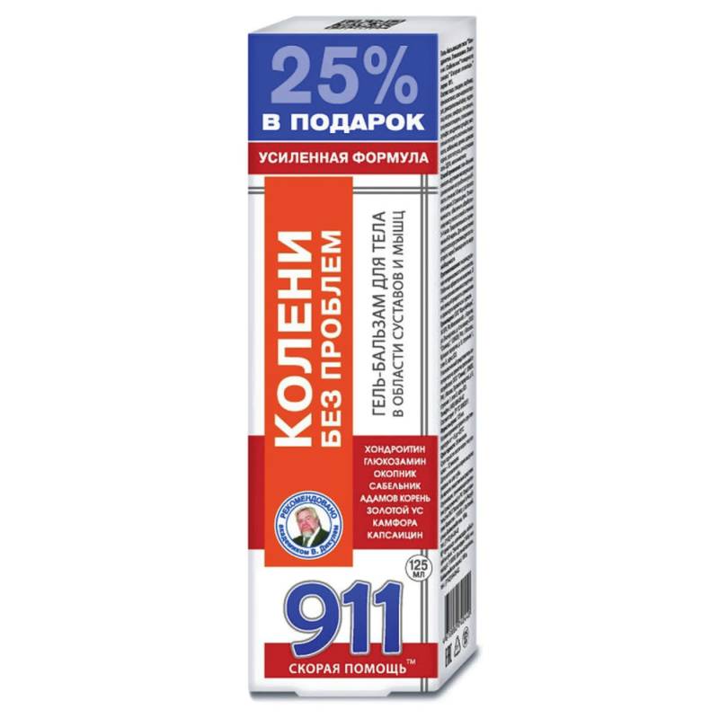 911 Скорая помощь Колени без проблем гель-бальзам для тела хондроитин, глюкозамин, окопник, сабельник, 125 мл