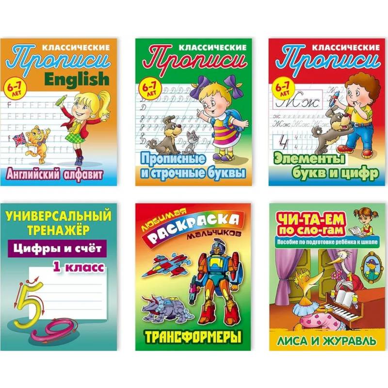 Комплект №3: Прописи "Английский алфавит", "Прописные и строчные буквы", "Элементы букв и цифр", Универсальный тренажер "Цифры и счет. 1 класс", Раскраска "Трансформеры", Читаем по слогам "Лиса и журавль".