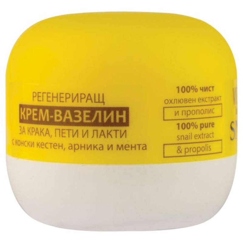 Специалисты «Виктория Бьюти» представляют вам регенерирующий крем-вазелин от трещин на ступнях, пятках и локтях. Содержит экстракт улитки, который помогает регенерировать клетки и восстанавливает их структуру. Его формула обогащена конским каштаном, обладающим антибактериальным и противовоспалительным действием.