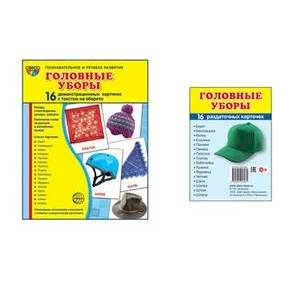 Комплект состоит из: Дем. картинки СУПЕР Головные уборы. 16 демонстр. картинок с текстом (173х220 мм) Дем. картинки СУПЕР Головные уборы. 16 раздаточных карточек с текстом (63х87 мм) Комплект состоит из демонстрационных картинок размером 173 х 220 мм и раздаточных карточек размером 63 х 87 мм, предназначен для работы с дошкольниками и младшими школьниками на индивидуальных и групповых занятиях. На лицевой стороне каждой картинки дается цветное изображение с указанием темы, на обратной - краткое описание, стихотворение, загадка и вопросы по теме. Название каждой темы имеет перевод на английский язык и соответствующую транскрипцию. Материал излагается доступным для ребенка языком и целиком раскрывает тему. При использовании демонстрационных картинок в комплекте с раздаточными карточками, взрослый (педагог) сможет проводить занятие с демонстрационным материалом, а детям на стол положить раздаточные карточки. Подобная работа будет эффективна, поскольку предполагает обратную связь с ребенком.