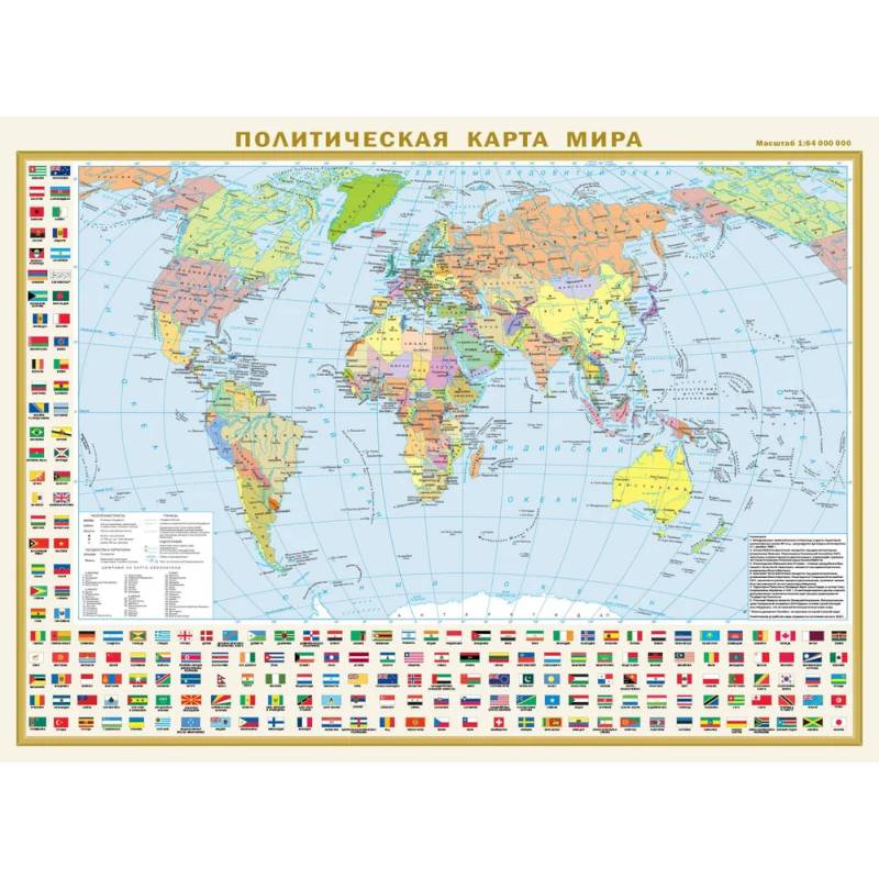 Двухсторонняя покрытая полимерной плёнкой карта имеет размеры 575 мм х 420 мм. На одной её стороне - Политическая карта мира в масштабе 1:80 000 000 (в 1 см 800 км), на другой – карта «Федеративное устройство России» масштаба 1:15 000 000 (в 1 см 150 км). На обновлённой Политической карте мира представлены все независимые государств мира с их столицами, а также владения и территории с особым статусом. Населённые пункты на карте даны в трёх градациях численности: более 1 млн жителей, от 100 тыс. до 1 млн, менее 100 тыс. жителей. Карта обрамлена официальными флагами государств мира, расположенными в алфавитном порядке, что облегчает их поиск. На новой карте "Федеративное устройство России" показаны все 89 субъектов Федерации с их столицами и центрами, включая новые - Донецкую и Луганскую народные республики, Запорожскую и Херсонскую области, Республику Крым и Севастополь. Субъекты РФ сгруппированы по 8 федеральным округам. Красочным обрамлением карты являются флаги и гербы республик, краёв, областей, автономных образований и городов – субъектов Российской Федерации. Рекомендовано для широкого круга пользователей. Карта упакована в прозрачный рукав из мягкого пластика. Размеры упаковки: длина 42 см, диаметр 4 см.