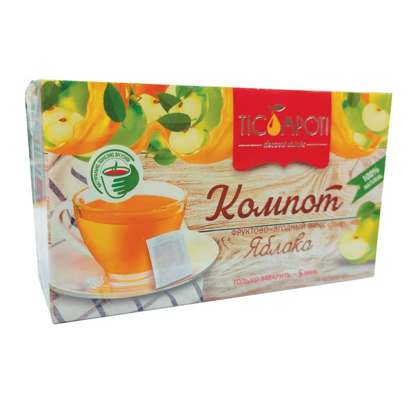 Натуральные фрукты и ягоды измельченные в разныхпропорциях: яблоко сушеное, абрикос сушеный, вишня сушеная, груша сушеная, шиповник сушеный, лимоннаякислота, сахар.