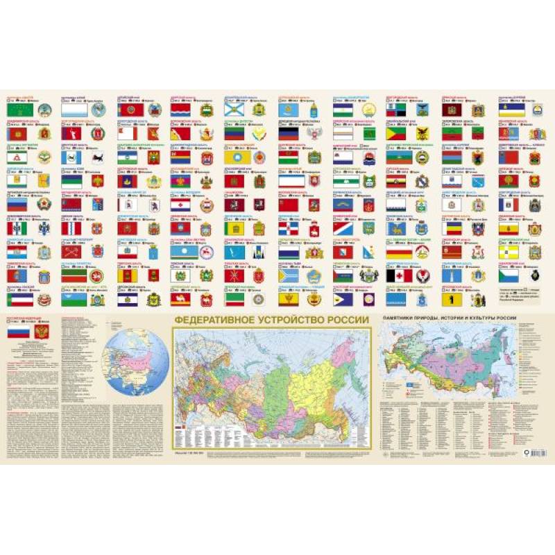 Двусторонний настенный плакат размером 1170х790 мм. На стороне с политической картой мира отображены флаги и гербы 196 независимых государств. На стороне с политико-административной картой России представлены флаги и гербы всех субъектов Федерации. Данный плакат станет полезным информационным акцентом в интерьере или украсит класс географии, что позволит школьникам обращать внимание на гербы и флаги, а следовательно, лучше запоминать информацию.